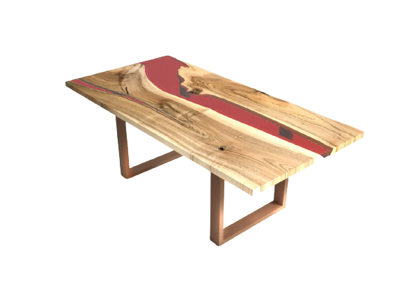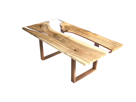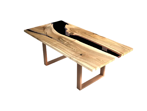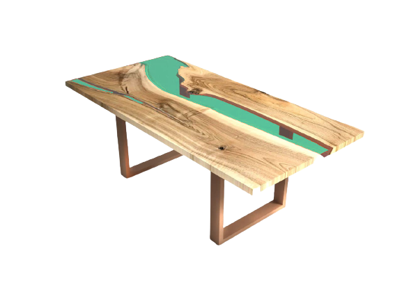 Une table en époxy est une combinaison de résine époxy et de bois massif de 100 ans. Souvent, dans les tables, on conserve la forme naturelle du bord extérieur de la table pour la mettre encore plus en valeur. La résine est versée dans les fissures, les trous dans le bois et entre les planches de bois massif, ce qui permet de créer un motif qui ressemble à une rivière qui coule. En anglais, ces tables sont appelées Epoxy River Tables (table rivière en époxy)