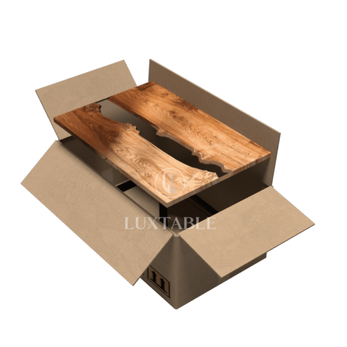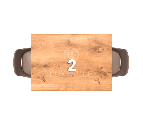 Il piano del tavolo è realizzato in noce europeo frastagliato, un legno pregiato caratterizzato da una trama intricata e venature uniche che conferiscono un senso di profondità e bellezza al tavolo. La superficie frastagliata del noce europeo aggiunge un tocco di rusticità e autenticità al design complessivo.